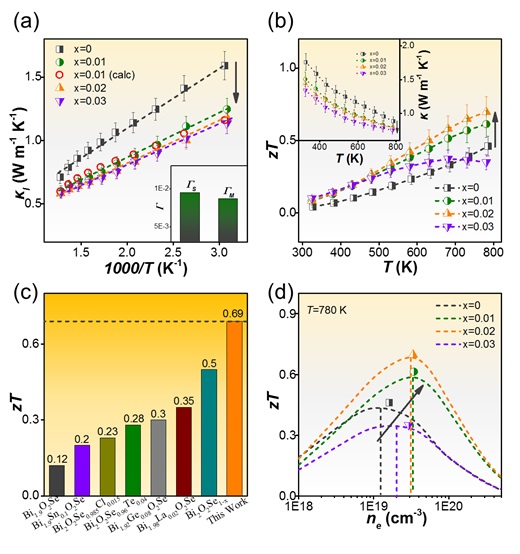 之后,课题组与澳大利亚南昆士兰大学陈志刚教授课题组合作,通过元素替代结合剪切剥离的方法,进一步优化了Bi2O2Se的热电性能,其中用Te元素取代O并剪切剥离得到的Bi2O2Se材料,其热电优值接近0.7,是之前最高纪录的两倍。相关工作近期发表在Scripta Materialia 178 (2020) 376–381和Nano Energy 69 (2020) 104394。