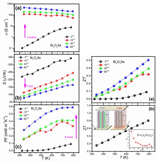 新型二维半导体材料Bi2O2Se因其独特的电子能带结构和晶体层状结构,在高速低功耗器件、量子输运器件、超快高敏红外光探测等方面展现出优异性能,近年来颇受科研工作者的关注。其中,在热电器件方面,n型Bi2O2Se被认为是搭配p型BiCuSeO的完美材料。然而,多晶块体Bi2O2Se因其低电导率(常温下低于1 Scm-1)而限制其热电性能的开发。传统的半导体工艺方法,如掺杂、固溶、点缺陷设计、复合等都无法显著地提升其电导率。因此,开发新的制备工艺对优化Bi2O2Se甚至其它二维材料十分必要。
