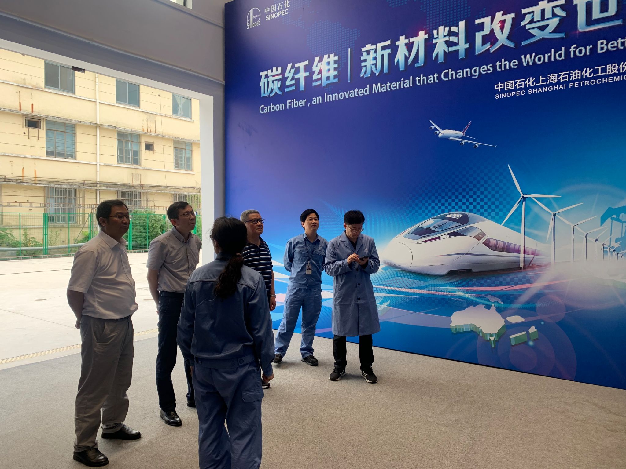 随后来到中国石化(上海)股份有限公司,先进材料创新研究公司党总支书记、总经理、公司员工林生兵等公司领导陪同崔升一行深入车间,详细介绍了大丝束碳纤维的工艺生产过程、碳纤维复合材料的研发应用情况。双方围绕科研项目深化合作、校企协同人才培养与输送等有关事宜进行深入研讨。