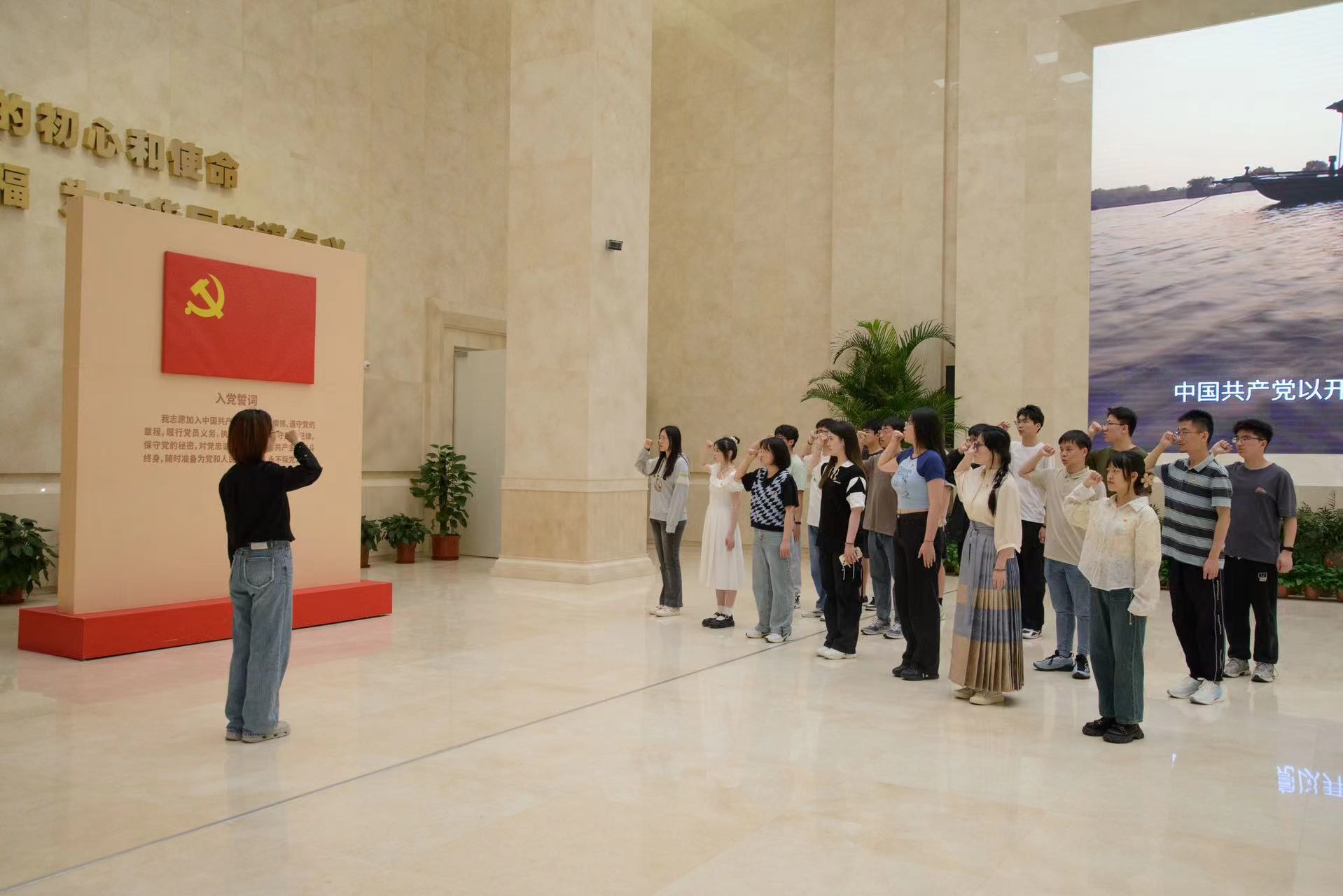 在中国共产党南京历史展览馆内,新发展的党员整齐列队,庄严肃立。本科生第一党支部支部书记丁楠带领党员们进行入党宣誓,用铿锵有力的誓言表达了对党的无限忠诚和为共产主义奋斗终身的坚定决心。