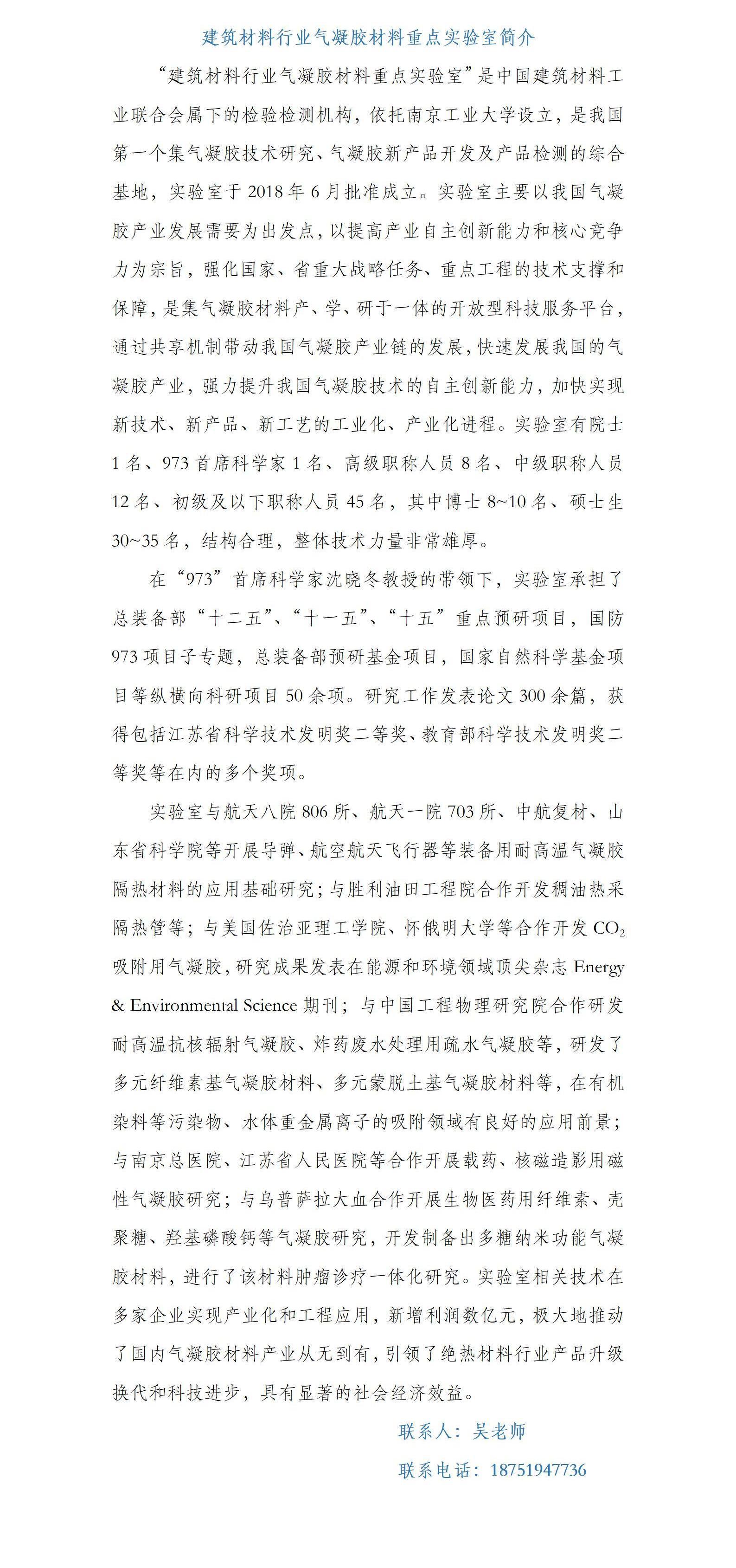 中国建筑材料联合会:中国建筑材料行业气凝胶材料重点实验室
