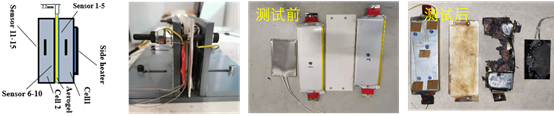 图1 简易模组示意图和照片 图2 测试前后气凝胶隔热片和电芯照片