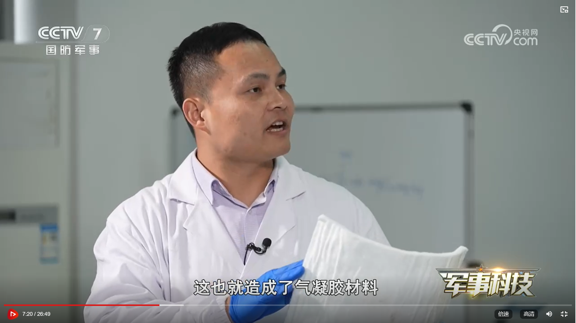 11月26日,中央电视台军事频道《军事科技》栏目以“‘材’霸天下”为题,通过沈晓冬教授及其团队的介绍和实验演示等,展示了气凝胶材料的独特属性和应用,为广大观众科普了先进材料,彰显了我国科技工作者投身科技自立自强的生动实践。