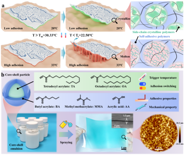 对此,公司郑严博士/陈双俊教授团队与南京大学周东山教授合作设计了一种可涂覆的热触发可切换粘合剂,它在皮肤温度(如33°C)下具有68.8 N/m的高粘合力,在轻微冷却(如20°C)后,粘合力降至6.59 N/m,从而实现10.4的高切换比。切换时间小于1 min。这种独特的性能是通过构建核壳粒子的策略,将侧链结晶聚合物和自粘性聚合物结合在一起而实现的。热分析、流变学和固体核磁共振的结果表明,材料内部快速、可逆的结晶-熔化转变是粘附切换的关键。通过使用喷涂技术将该材料沉积在柔性电极上,该团队获得了一种超薄(<5 μm)、可按需剥离的表皮电极,证明了乳液材料在制备穿戴舒适的表皮电子器件方面的优势。论文第一作者为陈双俊教授团队的郑严博士,论文题目为“Skin Temperature-Triggered Switchable Adhesive Coatings for Wearing Comfortable Epidermal Electronics”,发表于期刊《Chemical Engineering Journal》,此外,南京大学化学化工公司王晓亮教授为该论文的共同通讯作者。