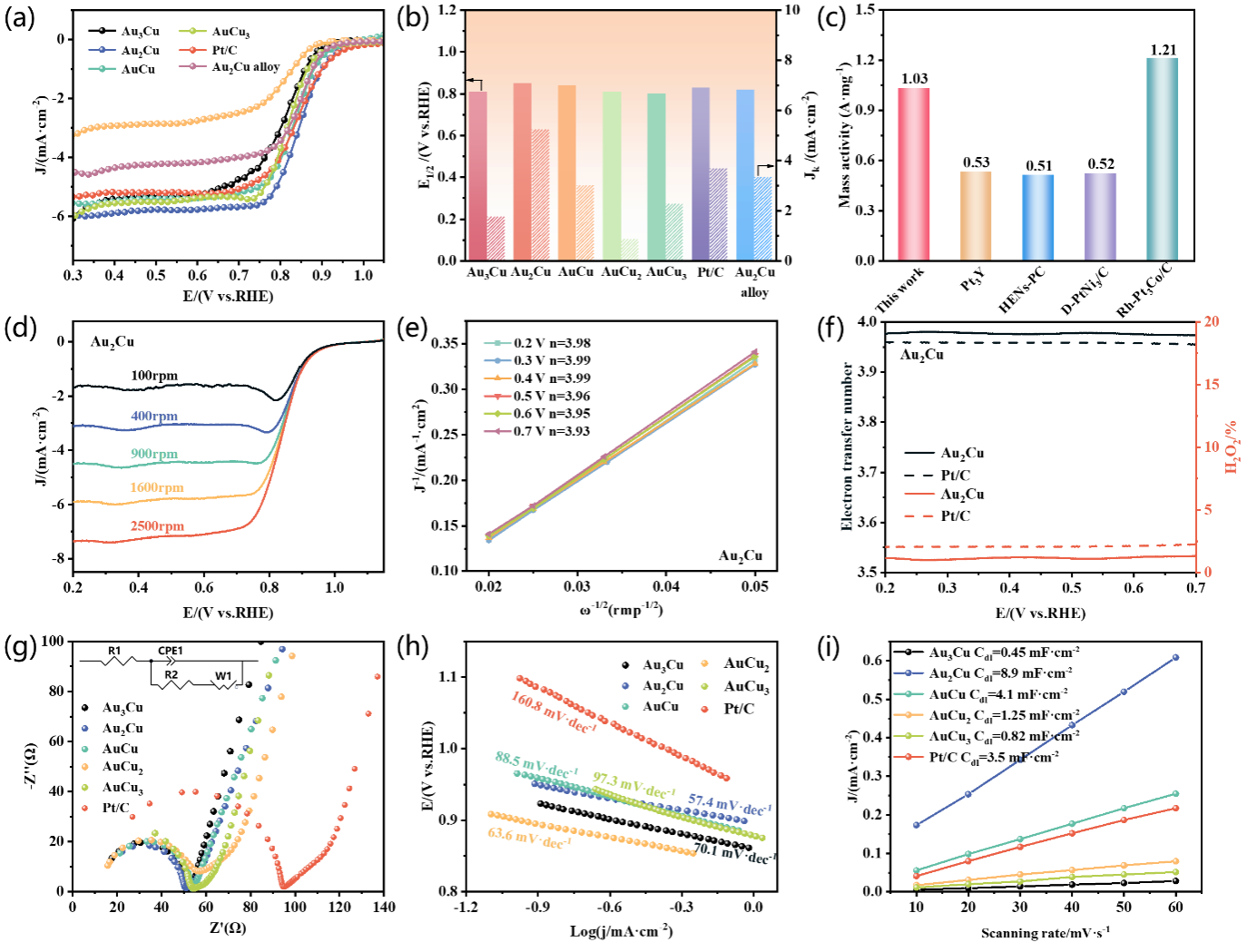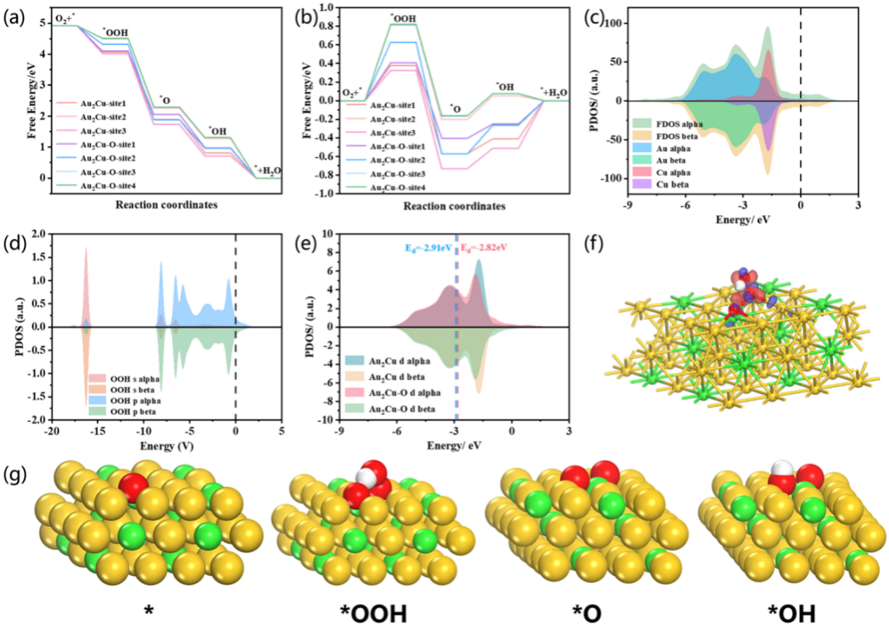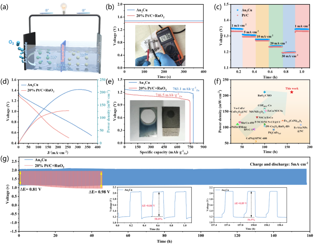 对此,公司崔升教授、吴晓栋副教授课题组基于高通量计算ORR火山图的指导,采用Au作为催化主体,并根据Sabatier原理引入Cu优化中间体吸附能。这种方法旨在实现既不太强也不太弱的最佳结合强度,在提高活性的基础上降低成本。通过金属粒子自组装和冷冻干燥技术相结合制备的一种新型Au2Cu合金气凝胶电催化剂,具有分级的"珍珠链状"气凝胶结构,高孔隙率和用于物质扩散的大比表面积。此外,Au2Cu合金气凝胶电催化剂在0.1 M KOH电解液中表现出较高的半波电位(0.85 V vs . RHE)和动力学电流密度(5.3 mA·cm-2)。此外,经5000次循环耐久性测试后,与商业Pt/C相比,Au2Cu合金气凝胶催化剂表现出优异的ORR稳定性、甲醇以及硫氰酸根离子耐受性。同时,组装的Au2Cu合金气凝胶基ZABs具有1.48 V的开路电压,211 mW·cm-2的大功率密度,并且在5 mA·cm-2的电流密度下进行160 h的充放电测试后仍保持优异的循环稳定性,表明其在ZABs和燃料电池领域具有优异的潜在应用价值。根据d带中心理论,部分氧化的Au2Cu合金气凝胶促进了能带中心远离费米能级,吸附物的反键能级降低,占据了更多的电子,从而降低了*OOH中间体的结合强度,这是ORR活性增强的原因。这项研究揭示了Au2Cu合金气凝胶催化剂在ORR中的反应机制,为开发低成本、高效、稳定的贵金属基电催化剂提供了新的思路。