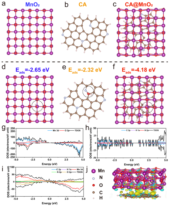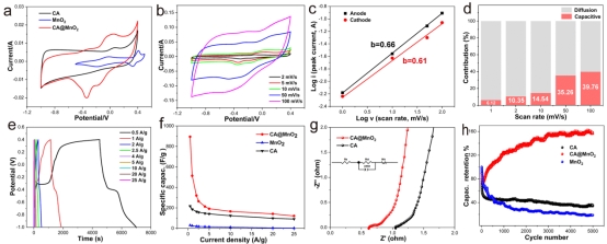 基于此,suncitygroup太阳集团崔升教授团队联合齐鲁工业大学(山东省科公司)伊希斌研究员展开合作研究,制备了具有具有氧化锰均匀包覆层的CA核壳异质结构(CA@MnO2)。在弱碱性条件下,Mn2+离子经历氧化还原反应,可控地在碳气凝胶骨架表面生长,形成均匀的二氧化锰壳层。CA@MnO2不仅具有三维多孔结构,而且具有丰富的孔径范围和高比表面积。同时,MnO2包覆层的存在可以增强CA在电化学循环过程中的结构稳定性。CA@MnO2气凝胶应用于超级电容器,表现出高比电容(895.0 F/g)和优异的循环性能。当用于对称双电极超级电容器时,它具有宽的工作电压范围(2.6 V),在功率密度为250.0 W/kg时,具有高的能量密度为144.2 Wh/kg,展现出卓越的电性能。计算结果表明,MnO2壳层和CA核之间存在明显的异质界面和强烈的相互作用,有效的提高了电极材料的导电性并增加其对OH的吸附能力。该研究揭示了核壳异质结构对碳气凝胶材料电化学性能的协同增强机制,为开发低成本、高效、稳定的超级电容器电极材料提供了新的思路。