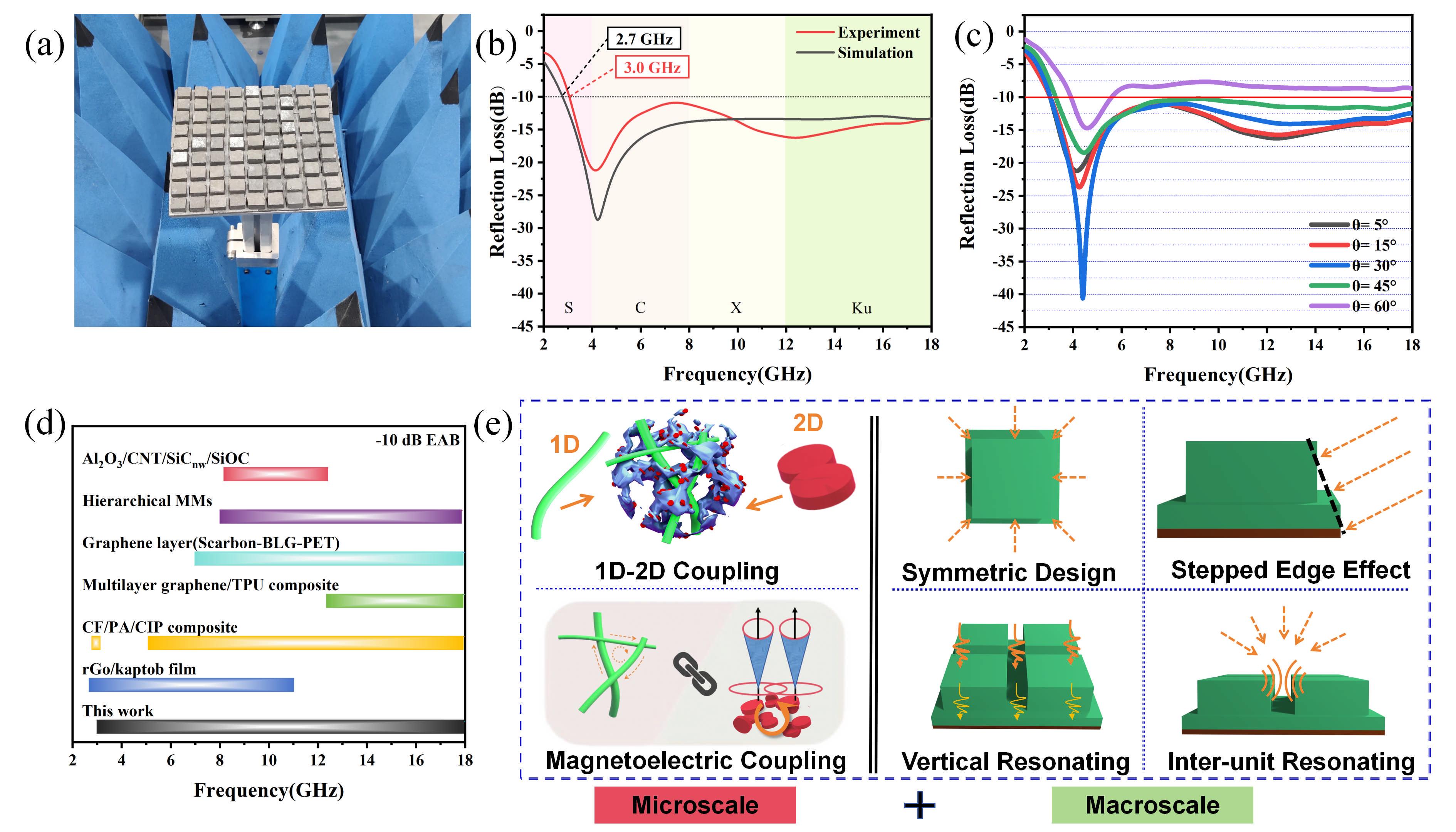 图1(a)弓形法反射率测试的测试现场照片。(b)超材料吸波体仿真数据与实验测试数据的对比图。(c)超材料吸波体的入射电磁波变角度微波吸收性能。(d)本研究与文献中其他结构设计微波吸收材料的性能对比。(e)材料微观与宏观相结合的微波吸收机理示意图。