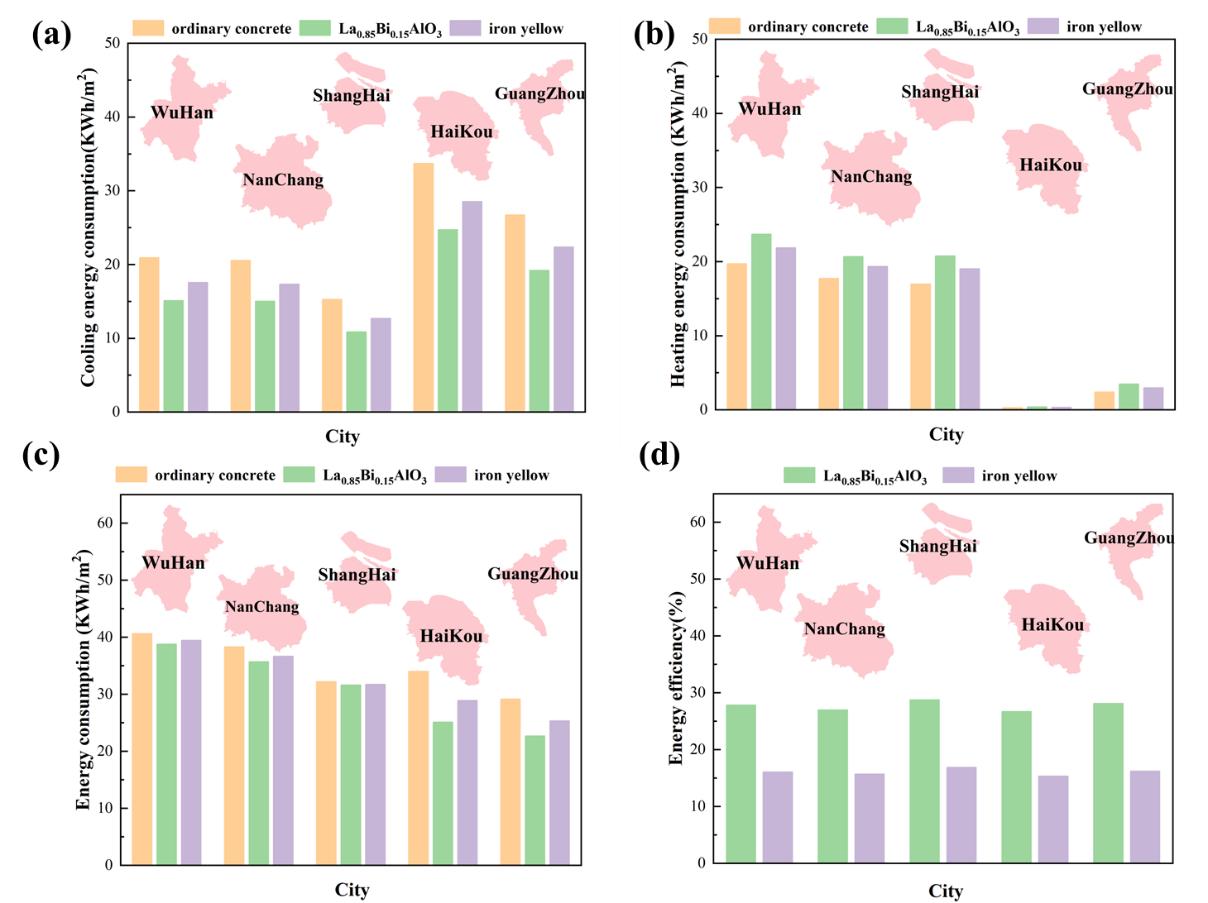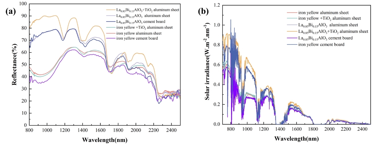 针对这一难点,suncitygroup太阳集团公司崔升教授、张垠教授课题组以LaAlO3钙钛矿为基体,引入Bi3+离子进行掺杂调控,构建了具备调色功能与高NIR反射性能兼容的La1-xBixAlO3黄色冷颜料体系。创新之处在于通过调节Bi3+掺杂比例,实现在可见光区增强吸收、形成明亮黄色的同时,保持近红外区的高反射能力,突破了传统颜料在色彩与热反射性能间的平衡瓶颈。样品经湿法球磨与高温固相法合成后,XRD证实所有样品保持钙钛矿单一相结构,Raman光谱进一步确认Bi–O键的存在,表明掺杂未破坏晶体骨架。在性能方面,该颜料在700–2500 nm波段的近红外反射率最高可达98.95%,并在模拟阳光照射下相比传统铁黄涂层有效降低表面温度4–5°C,具备优异的热屏蔽能力。耐久性测试结果显示,在酸碱溶液浸泡与户外老化条件下,颜料的色差ΔE*均小于4,近红外反射性能几乎不变,表现出极强的环境稳定性。此外,EnergyPlus模拟结果表明,该颜料涂层可使南方典型城市建筑年冷却能耗降低26%–28%。综合考虑其原料来源丰富、合成工艺简便、性能优异、成本可控,该材料具有显著的经济性和可推广性,在绿色建筑、交通涂层及户外节能领域展现出广阔应用前景。