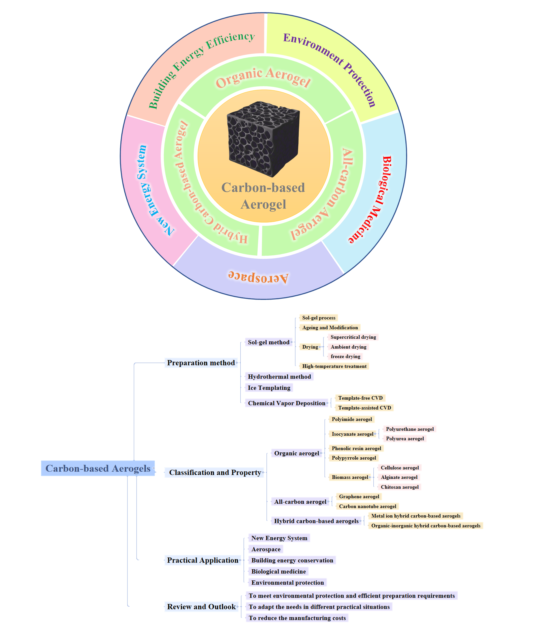 随着科学技术的不断发展和学科交叉融合的推进,材料科学正逐步走向多元化发展。碳基气凝胶及其复合材料的出现,不仅满足了社会对材料高性能日益增长的需求,还在一定程度上替代了传统的无机和有机材料。由于其多样的分子结构、可设计的分子构架、可控的孔结构构建以及优异的力学性能,使得它们在航空航天、建筑保温、吸附分离、储能和电磁防护等领域具有重要的研究价值。凭借碳基气凝胶及其复合材料独特的性能优势,预示着广阔的发展前景,有望成为引领未来高性能气凝胶产品的代表。