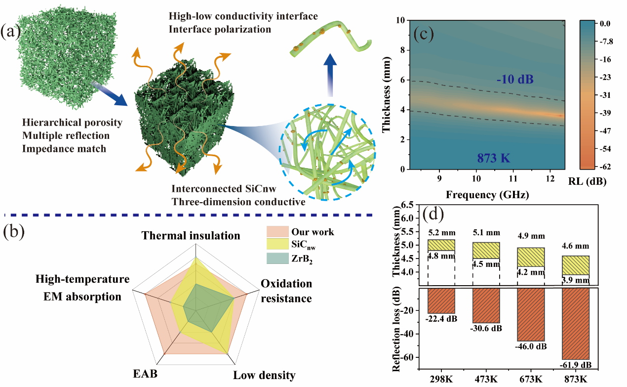 图1 ZrB2@SiCnw纳米复合气凝胶(a)吸波机理示意图、(b)性能概览图、(c)873 K下反射损耗的2D图以及(d)298 K ~ 873 K温域内的厚度容差以及最低反射损耗。