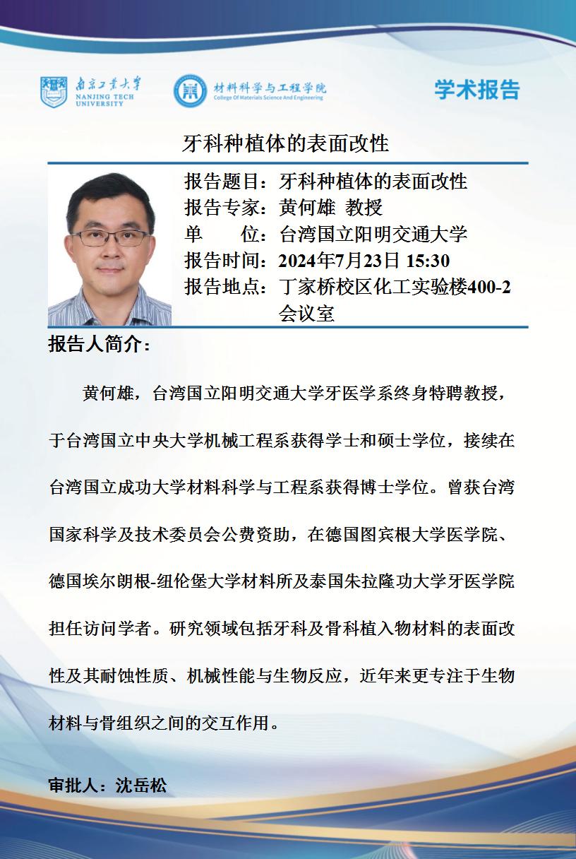 黄何雄,台湾阳明交通大学牙医学系终身特聘教授,于台湾中央大学机械工程系获得学士和硕士学位,接续在台湾成功大学材料科学与工程系获得博士学位。曾获台湾国家科学及技术委员会公费资助,在德国图宾根大学医公司、德国埃尔朗根-纽伦堡大学材料所及泰国朱拉隆功大学牙医公司担任访问学者。研究领域包括牙科及骨科植入物材料的表面改性及其耐蚀性质、机械性能与生物反应,近年来更专注于生物材料与骨组织之间的交互作用。
