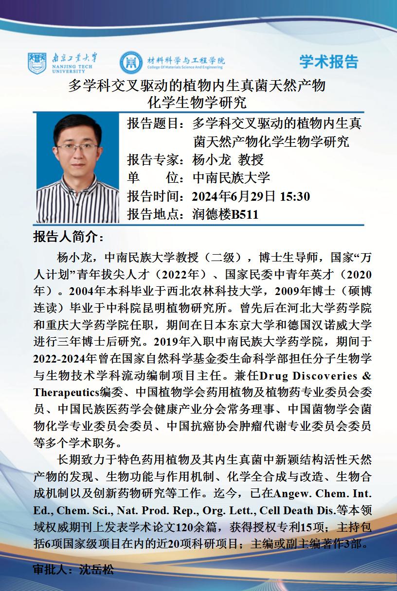 杨小龙,中南民族大学教授(二级),博士生导师,国家青年拔尖人才(2022年)、国家民委中青年英才(2020年)。2004年本科毕业于西北农林科技大学,2009年博士(硕博连读)毕业于中科院昆明植物研究所。曾先后在河北大学药公司和重庆大学药公司任职,期间在日本东京大学和德国汉诺威大学进行三年博士后研究。2019年入职中南民族大学药公司,期间于2022-2024年曾在国家自然科学基金委生命科学部担任分子生物学与生物技术学科流动编制项目主任。兼任Drug Discoveries&Therapeutics编委、中国植物学会药用植物及植物药专业委员会委员、中国民族医药学会健康产业分会常务理事、中国菌物学会菌物化学专业委员会委员、中国抗癌协会肿瘤代谢专业委员会委员等多个学术职务。