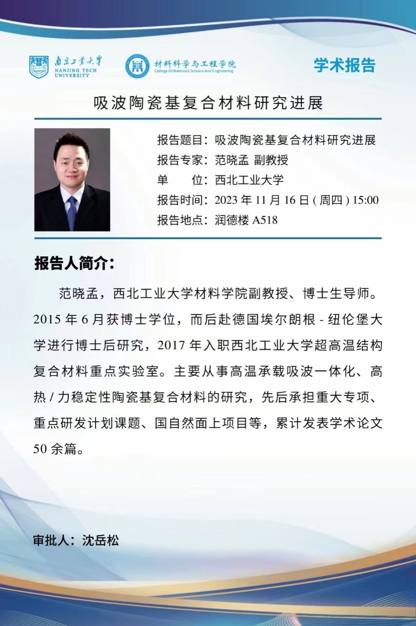 范晓孟,西北工业大学suncitygroup太阳集团副教授、博士生导师。2015年6月获博士学位,而后赴德国埃尔朗根-纽伦堡大学进行博士后研究,2017年入职西北工业大学超高温结构复合材料重点实验室。主要从事高温承载吸波一体化、高热/力稳定性陶瓷基复合材料的研究,先后承担重大专项、重点研发计划课题、国自然面上项目等,累计发表学术论文50余篇。