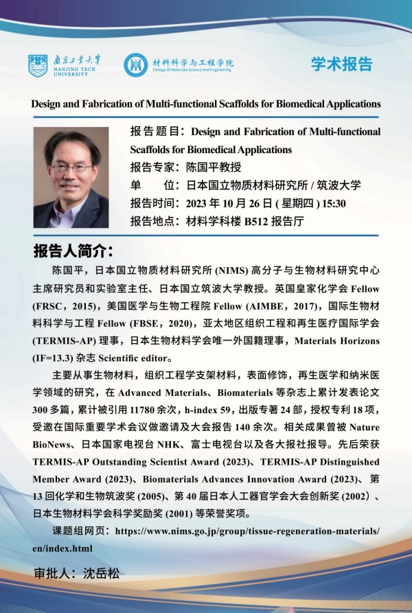 陈国平,日本国立物质材料研究所(NIMS)高分子与生物材料研究中心主席研究员和实验室主任,日本国立筑波大学教授。1997年博士毕业于京都大学材料化学系高分子生物材料专业,随后开展博士后研究。2000年加入日本国立产业技术综合研究所组织工程学研究中心担任研究员,并于2003年升任主任研究员。2004年加入NIMS生物材料研究中心,2007年升任为课题组组长,2011年至2017年担任NIMS国际纳米结构材料研究基地(MANA)首席研究员(PI)和组织工程学材料研究中心主任。2013年起兼任筑波大学物质材料工学系教授。2015年入选英国皇家化学会Fellow (FRSC),2017年当选美国医学与生物工程院Fellow (AIMBE),2020年当选国际生物材料科学与工程Fellow (FBSE)。同时担任亚太地区组织工程和再生医疗国际学会(TERMIS-AP)理事,日本生物材料学会唯一外国籍理事,Materials Horizons (IF=13.3)杂志Scientific editor,多部期刊的编委和顾问编委,日本新能源和发展机(NEDO)的重大研究课题评议和日本国家自然科学基金等项目评审专家。先后荣获TERMIS-AP Outstanding Scientist Award (2023)、TERMIS-AP Distinguished Member Award (2023)、Biomaterials Advances Innovation Award (2023)、第13回化学和生物筑波奖(2005)、第40届日本人工器官学会大会创新奖(2002)、日本生物材料学会科学奖励奖(2001)。