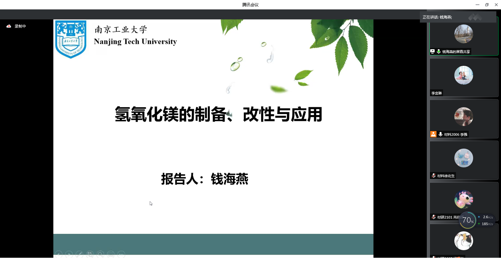 钱海燕教授作了以“氢氧化镁的制备、改性与应用”为主题的报告,系统讲解了氢氧化镁在阻燃与环保领域具有较为广泛的前景;并以课题组研究成果为例,深入浅出地介绍了氧化镁水化法制备六方片氢氧化镁及改性技术,此种方法大幅度提高PP/MH复合材料的力学性能。