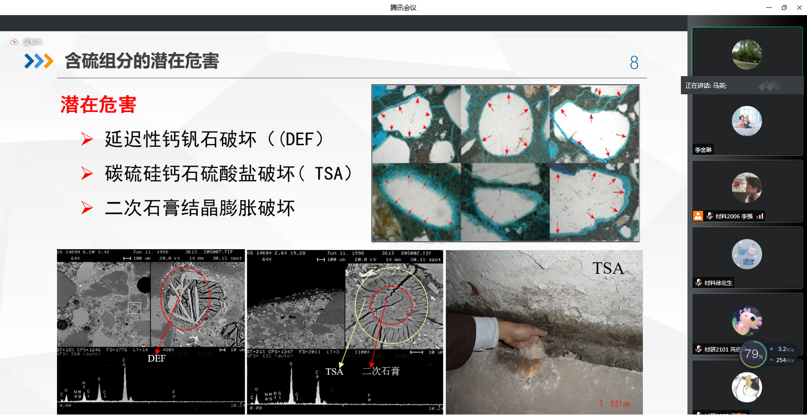 马英老师作了主题为“含硫组分和产物对水泥基材料性能影响研究”的报告,介绍了硫的来源和含硫组分分布,并分别对含硫组分对水化硬化性能影响、含石灰石质材料硫酸盐侵蚀耐久性以及新型含硫胶凝材料制备和性能等方面进行了充分严谨的分析和论述。