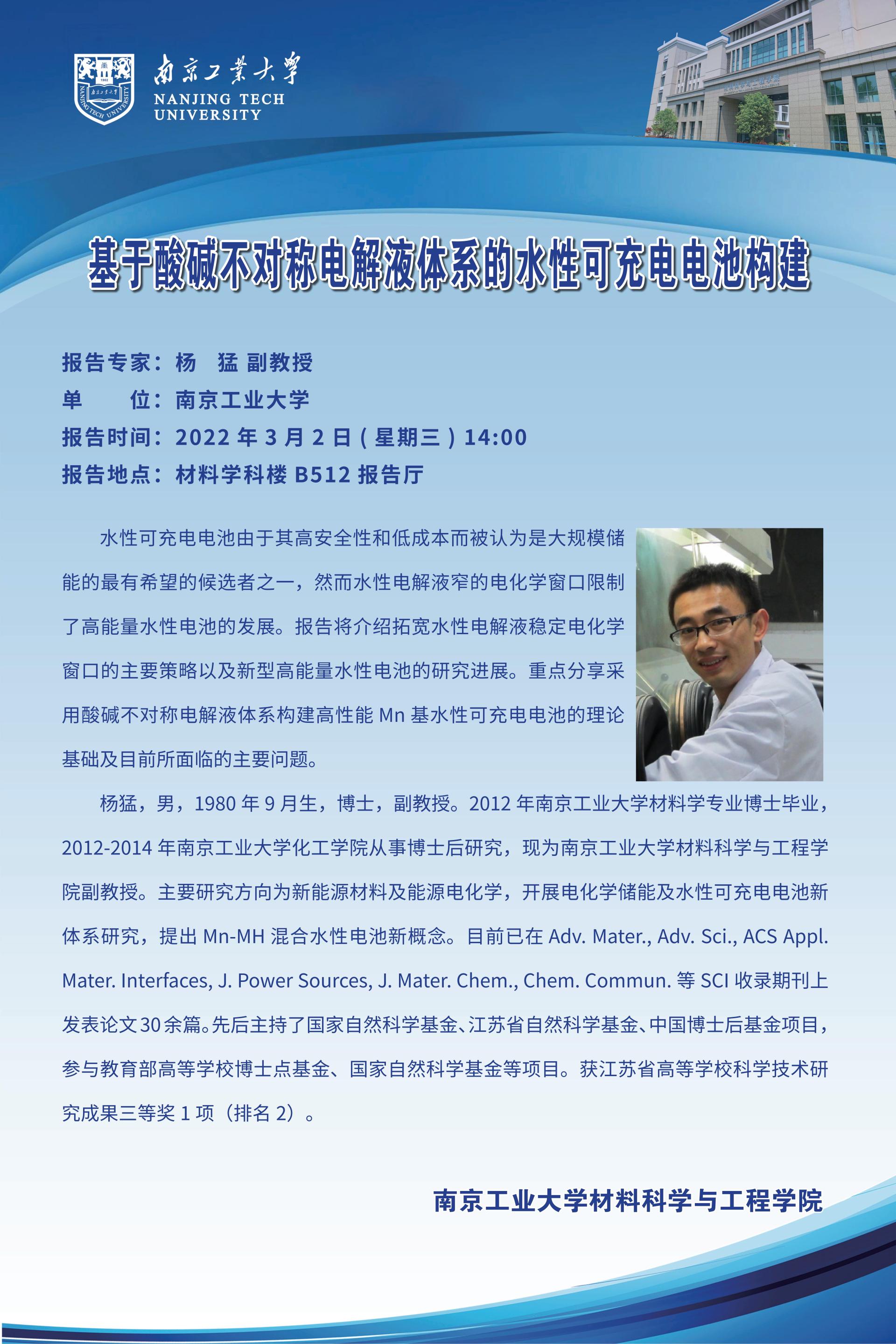 【导师学术报告会】基于酸碱不对称电解液体系的水性可充电电池构建