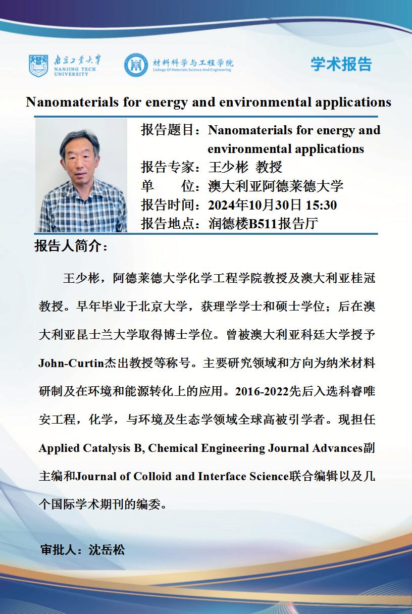 【学术报告】王少彬教授学术报告会-Nanomaterials for energy and environmental applications