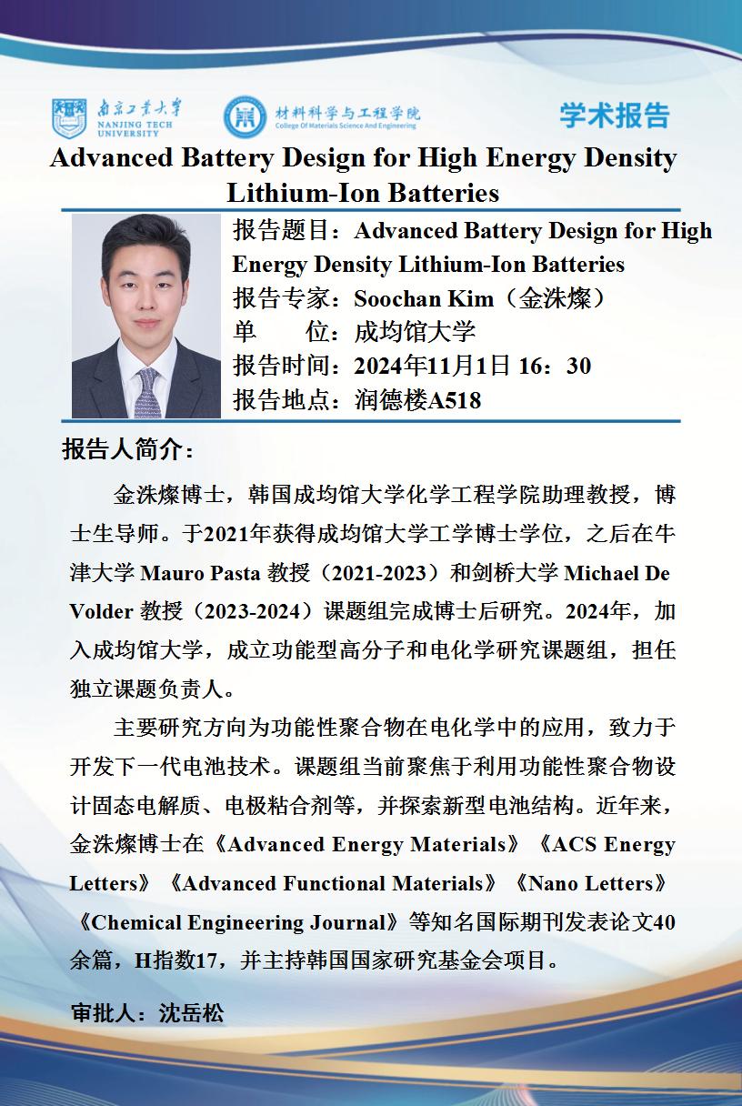 报告人简介:金洙燦博士,韩国成均馆大学化学工程公司助理教授,博士生导师。于2021年获得成均馆大学工学博士学位,之后在牛津大学 Mauro Pasta 教授(2021-2023)和剑桥大学 Michael De Volder 教授(2023-2024)课题组完成博士后研究。2024年,加入成均馆大学,成立功能型高分子和电化学研究课题组,担任独立课题负责人。