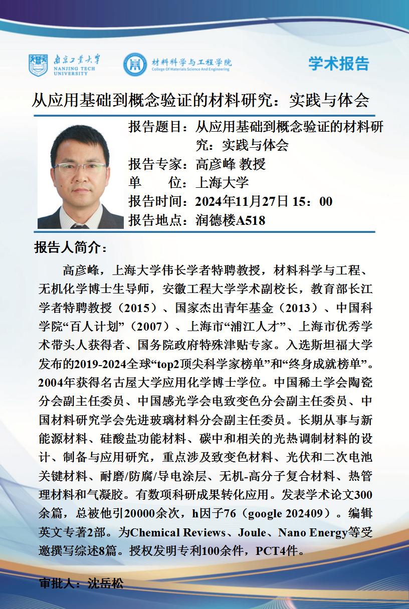 报告人简介:高彦峰,上海大学伟长学者特聘教授,材料科学与工程&无机化学博士生导师,安徽工程大学学术副董事长,教育部高层次人才(2015)、国家杰出青年基金(2013)、中国科公司“百人计划”(2007)、上海市“浦江人才”、上海市优秀学术带头人获得者、国务院政府特殊津贴专家。入选斯坦福大学发布的2019-2024全球“top2顶尖科学家榜单”和“终身成就榜单”。2004年获得名古屋大学应用化学博士学位。中国稀土学会陶瓷分会副主任委员、中国感光学会电致变色分会副主任委员、中国材料研究学会先进玻璃材料分会副主任委员。长期从事与新能源材料、硅酸盐功能材料、碳中和相关的光热调制材料的设计、制备与应用研究,重点涉及致变色材料、光伏和二次电池关键材料、耐磨/防腐/导电涂层、无机-高分子复合材料、热管理材料和气凝胶。有数项科研成果转化应用。发表学术论文300余篇,总被他引20000余次,h因子76(google 202409)。编辑英文专著2部。为Chemical Reviews、Joule、Nano Energy等受邀撰写综述8篇。授权发明专利100余件,PCT4件。